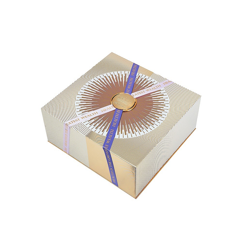 Designed for the absolute pinnacle of premium gifting, this multi-tiered rigid box offers an unparalleled unboxing theater. Removing the top lid reveals an inner double-door compartment secured by a custom ribbon and metal logo plaque. Opening these doors unveils the first tier of products, which can be lifted to expose a hidden base layer. Crafted with metalized silver cardstock, full-coverage UV printing, and hot stamping, it is the ultimate packaging solution for premium health tonics, luxury cosmetics, limited-edition confections, and VIP corporate gifts.